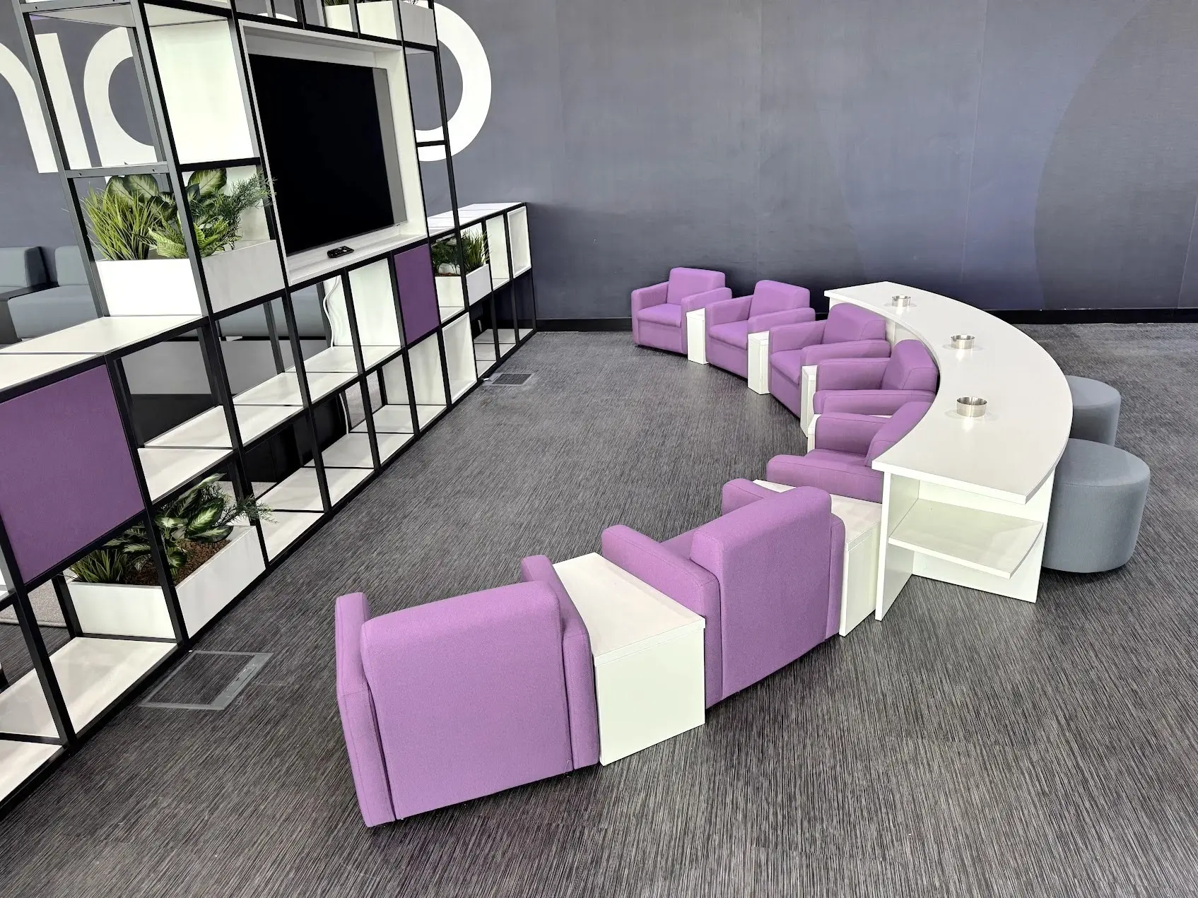 Interact provided a fully bespoke package to Hippo, ensuring all furniture was made to order in the client’s preferred materials and finishes. A standout feature of this project and design is the dedicated children’s area, providing a relaxed space to watch TV and play whilst parents browse the wide selection of vehicles. This consisted of mini armchairs in Hippo’s signature purple, lower tables and stools, and a media wall with built-in storage, prioritising the appeal to the younger audience.