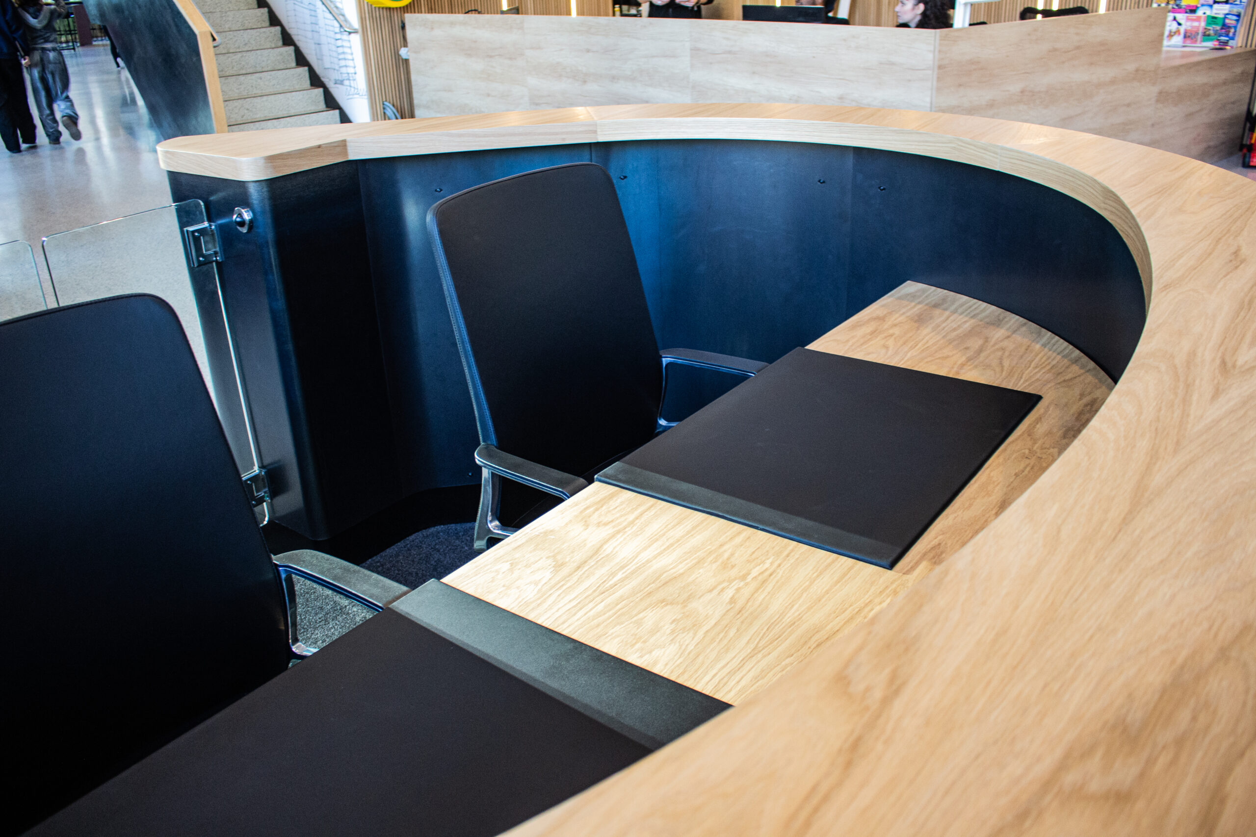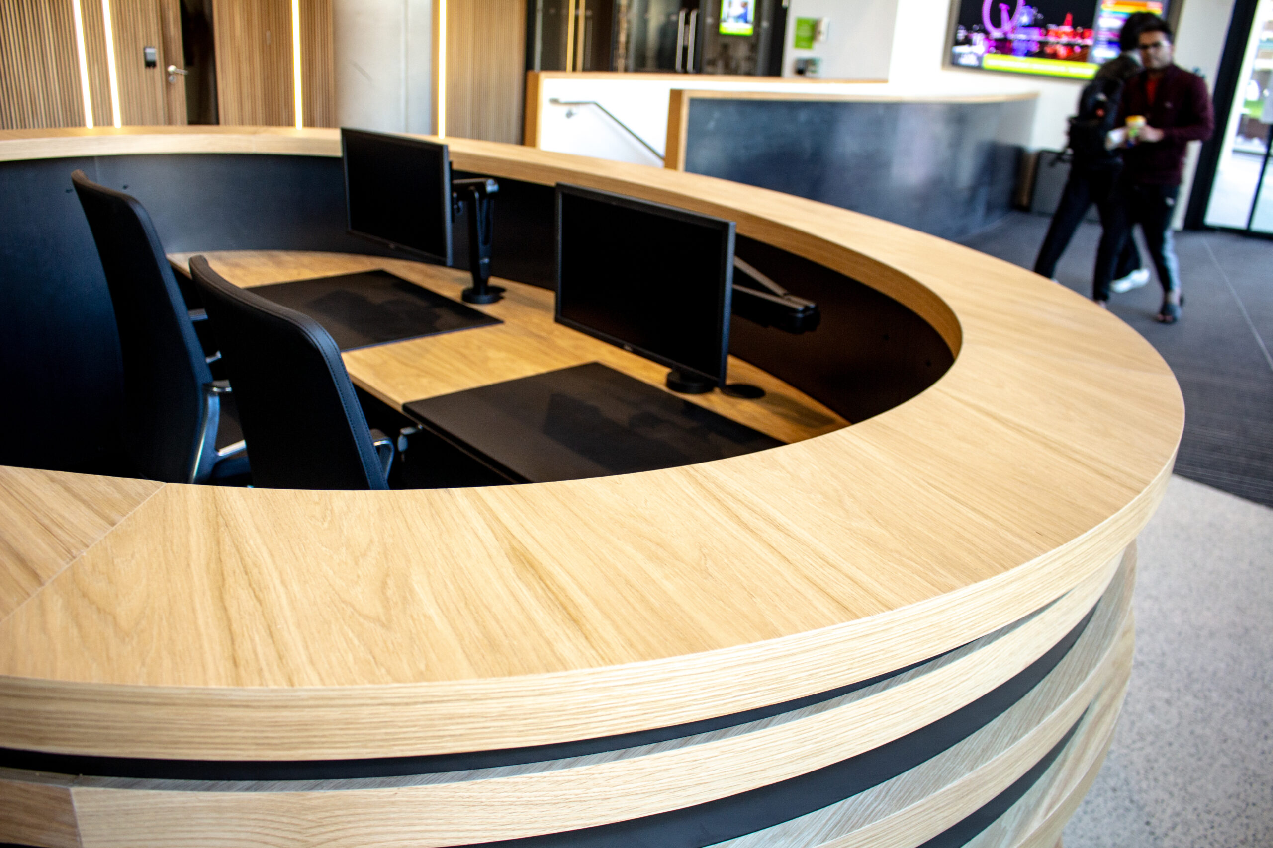 This project required us to work hand in hand with a talented architect in order to bring their vision to life. The design brief focused on creating an elliptical shape to the desk to mirror the architecture of the accommodation building. Our challenge lay in translating that concept into a practical, hard-wearing piece of furniture that supports day-to-day reception activity, while also tailoring the size, orientation and access points to suit the realities of the site.