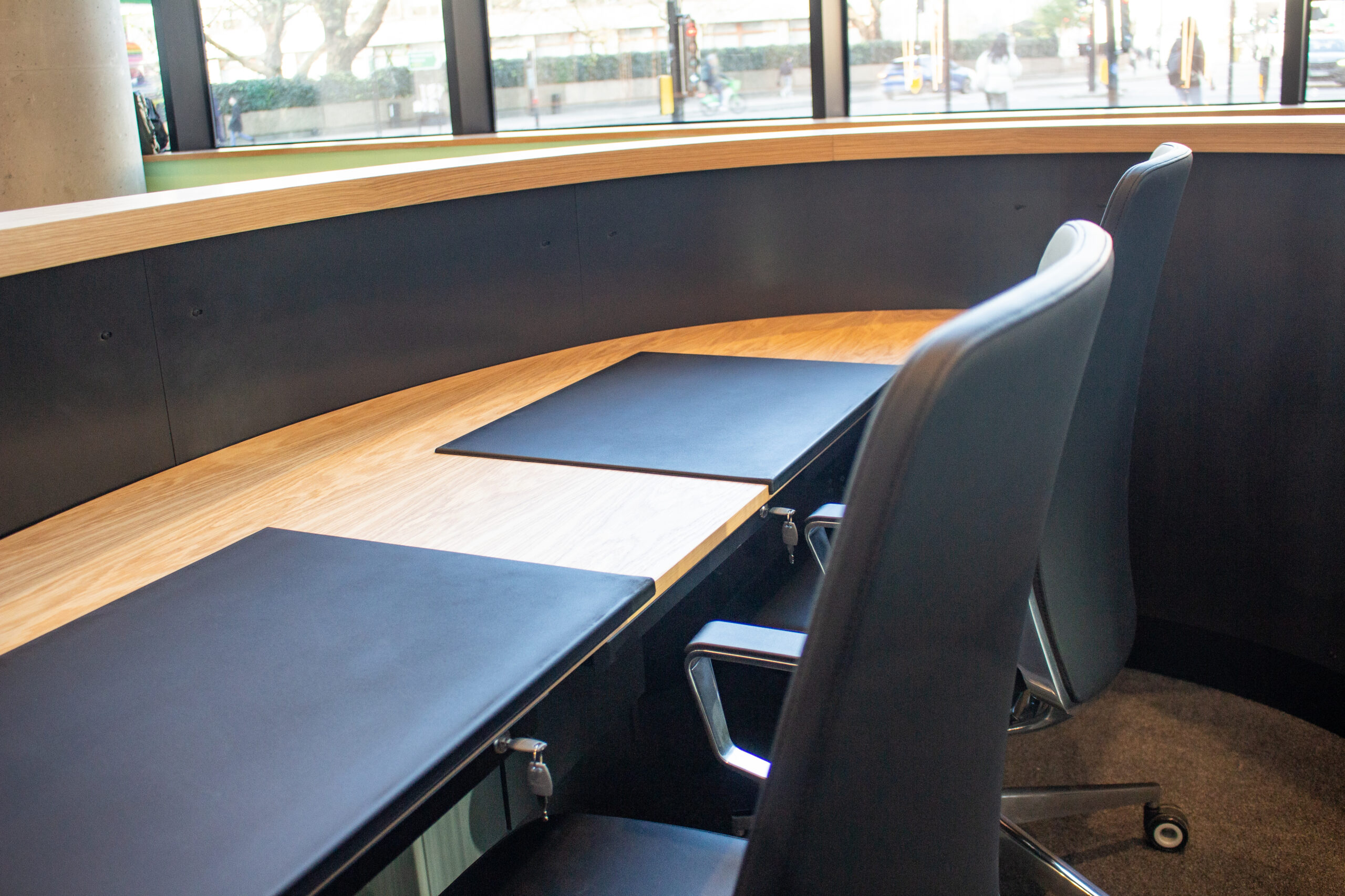 To ensure the final result met the highest standard, the desk was pre-assembled at our Interact offices before being transported to site. This allowed us to carry out thorough quality control checks and complete detailed hand-finishing in a controlled environment, ensuring the execution was exemplary. Pre-assembly also helped minimise risk during installation, confirming alignment, fit and finish prior to arriving on site and enabling a smoother, more efficient final install at the Westminster location.